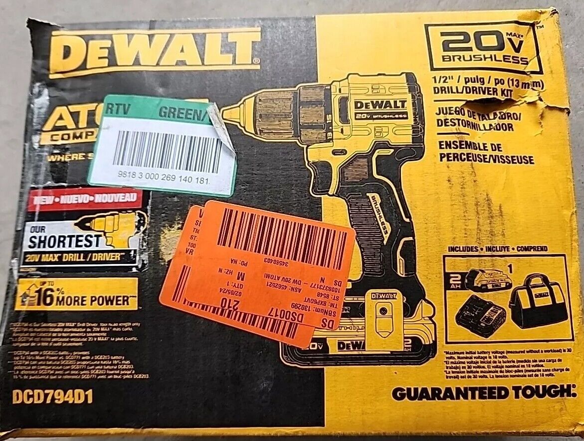 Dewalt DCD794D1 1/2" Drill/Driver 20v 2Ah Battery, Charger & Carry Bag Free Ship