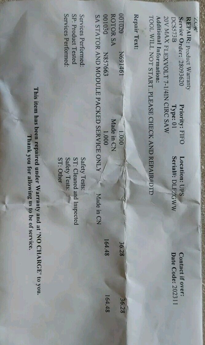 This tool has been refurbished under warranty by the Dewalt Factory Service Center (see ticket details in pictures).